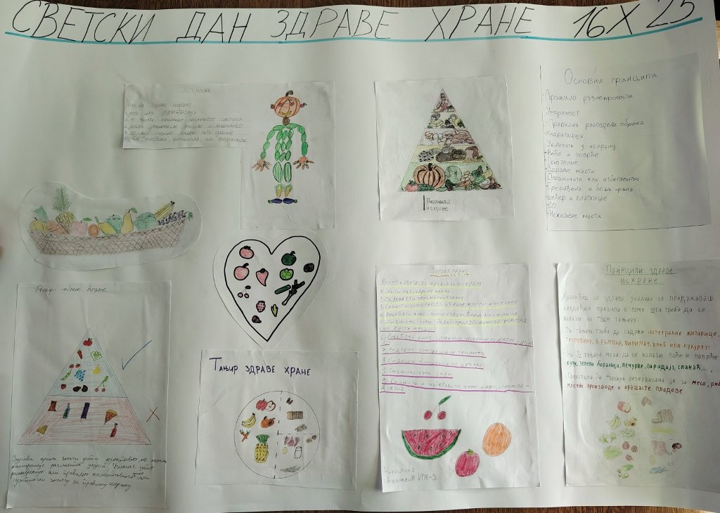 На Светски дан здраве хране 16.10. наставница биологије, Оливера Боздић била је организатор радионице о здравој исхрани. Ученици од 5.-8. разреда дискутовали су о принципима здраве исхране и какав треба да буде ,,код“ здраве исхране који води ка добром здрављу, неопходном за правилан развој деце. Пирамиду здраве исхране и тањир здраве хране, деца су представила на плакатима. Светлана Ђурђевић, наставница ликовног представила је ликовне радове ученика 5/1, 5/2, 5/3 на тему ,,Воће“. Циљ радионице је промовисање здравих животних стилова и значај правилне и разноврсне исхране.